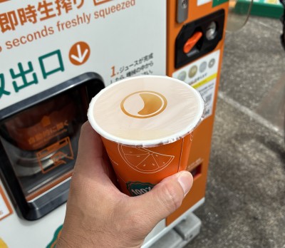 前から気になってた生搾りオレンジジュースの自動販売機で買ってみた。エレメカ機構が現代のオートスナックって感じで良い。350円とまあまあ高価だけど確かにうまかった。ジューススタンドだと400〜500円ぐらいするだろうからちょっとだけ安い。